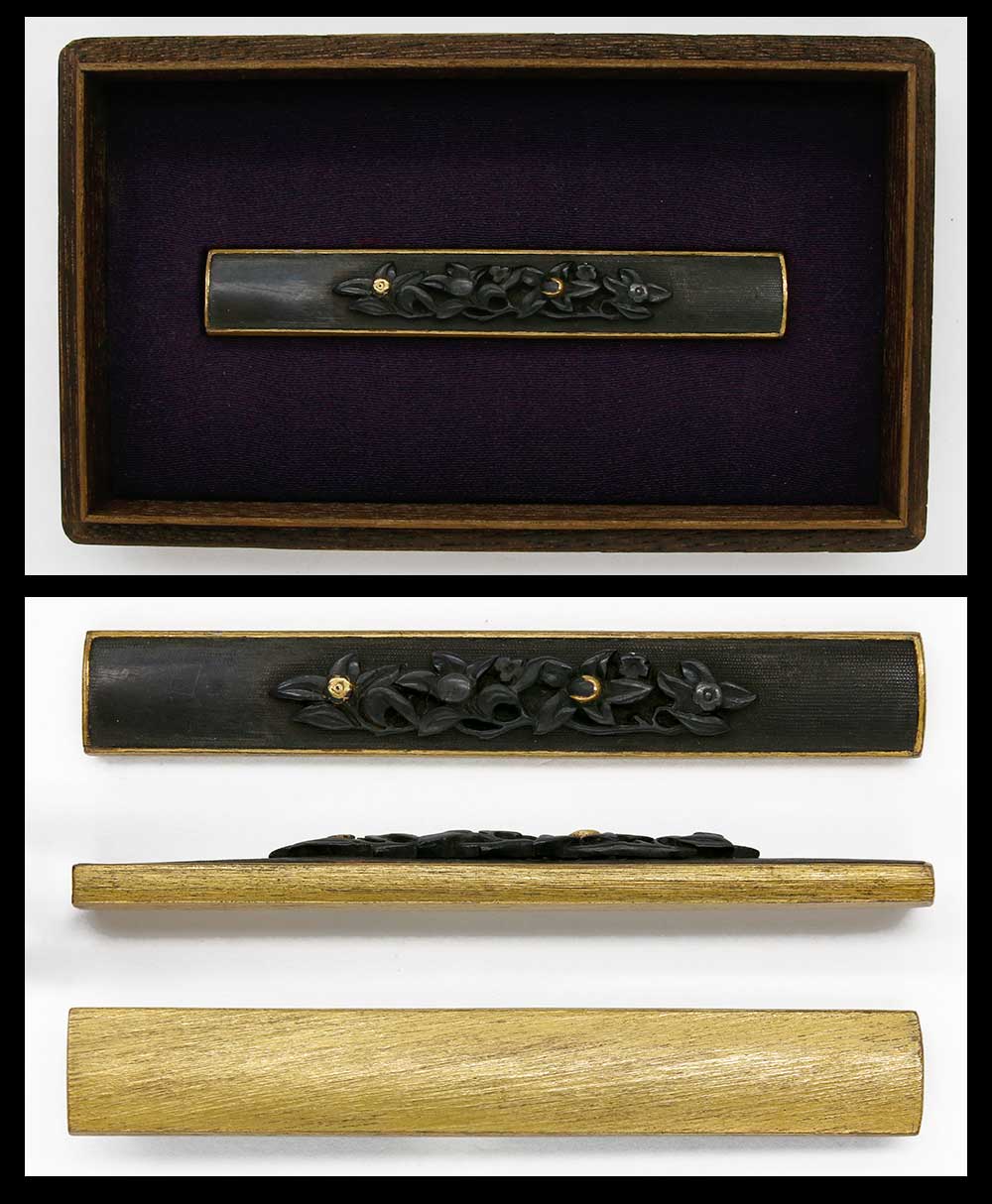 Special feature: Shakudo Nanako plate, flower is engraved with gold color.