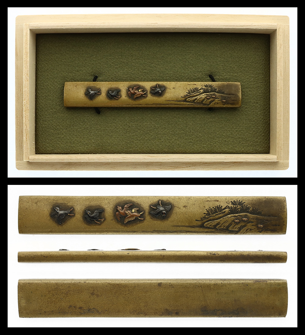 Features: Birds design carved in high relief on a brass ground, with inlaid polychrome decoration.