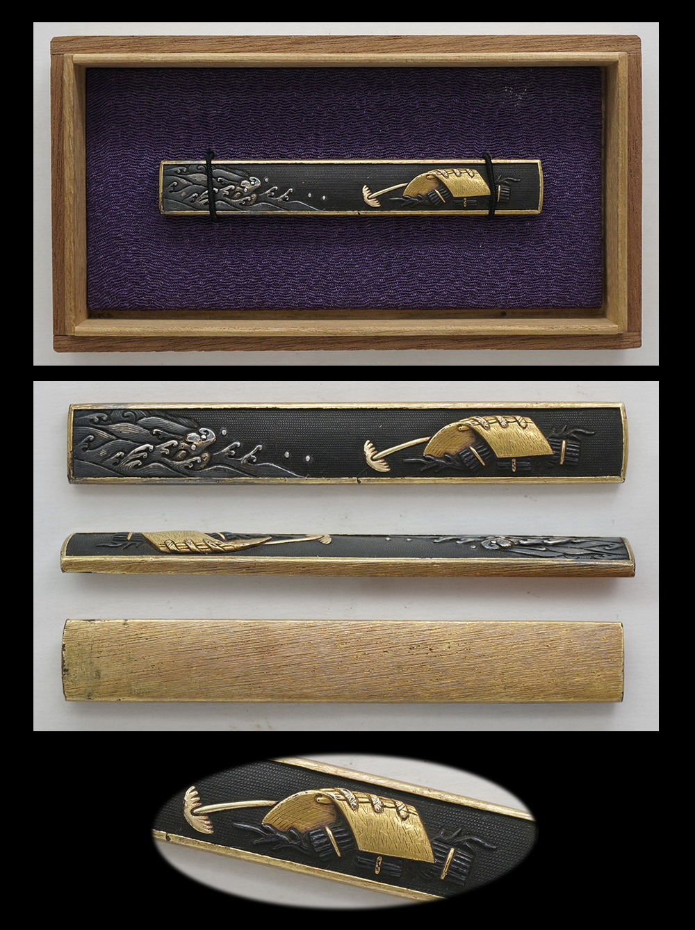 Special feature: On shakudou nanakoji base, salt shed is engraved and inlayed with gold. The composition of the kozuka is beautiful.