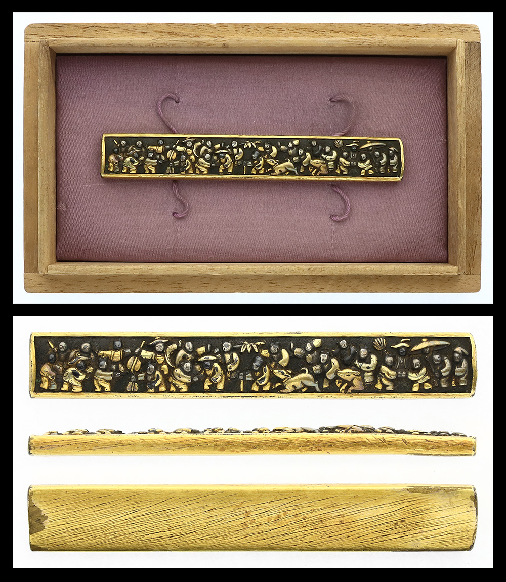 Shakudo nanako ground with a high-relief carving of a figure, finished with gold iro-e decoration.