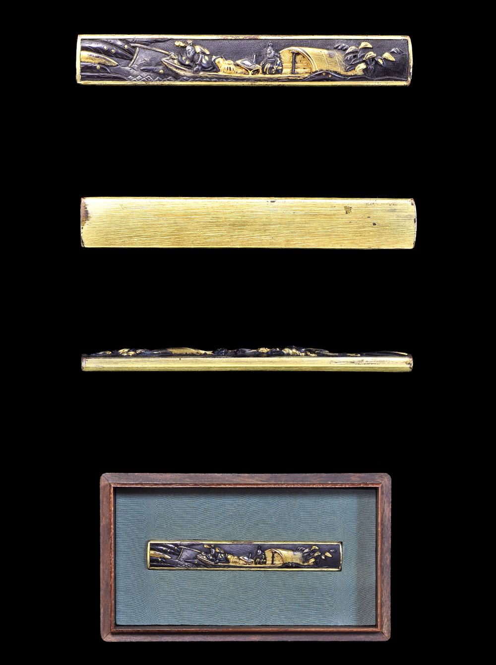 Special feature: On the Shakudo nanako plate, men (angler and writer) and a ship and wave etc are engraved,with gold and silver color iroe.