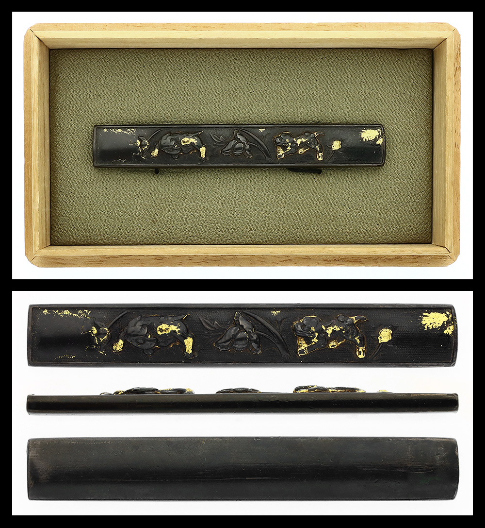 Features: Shakudo nanako base. Puppies are engraved with gold.