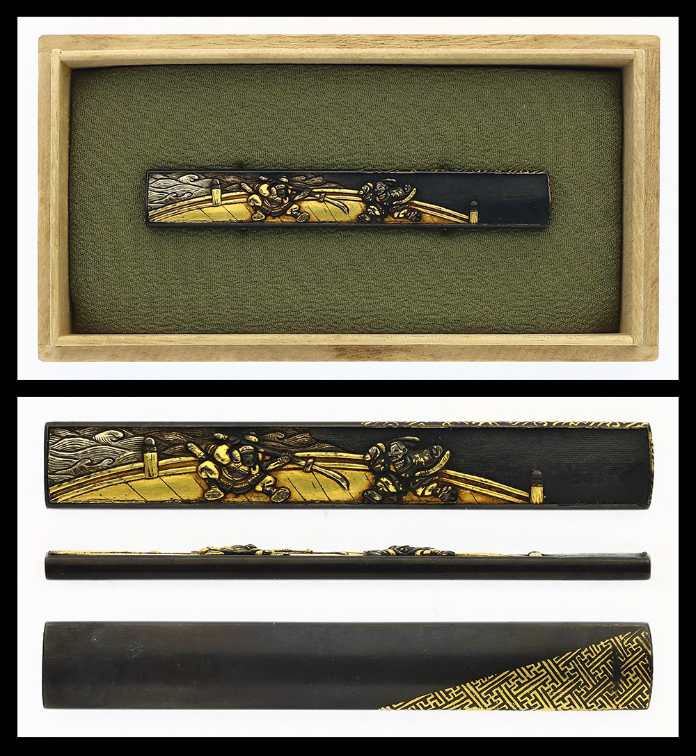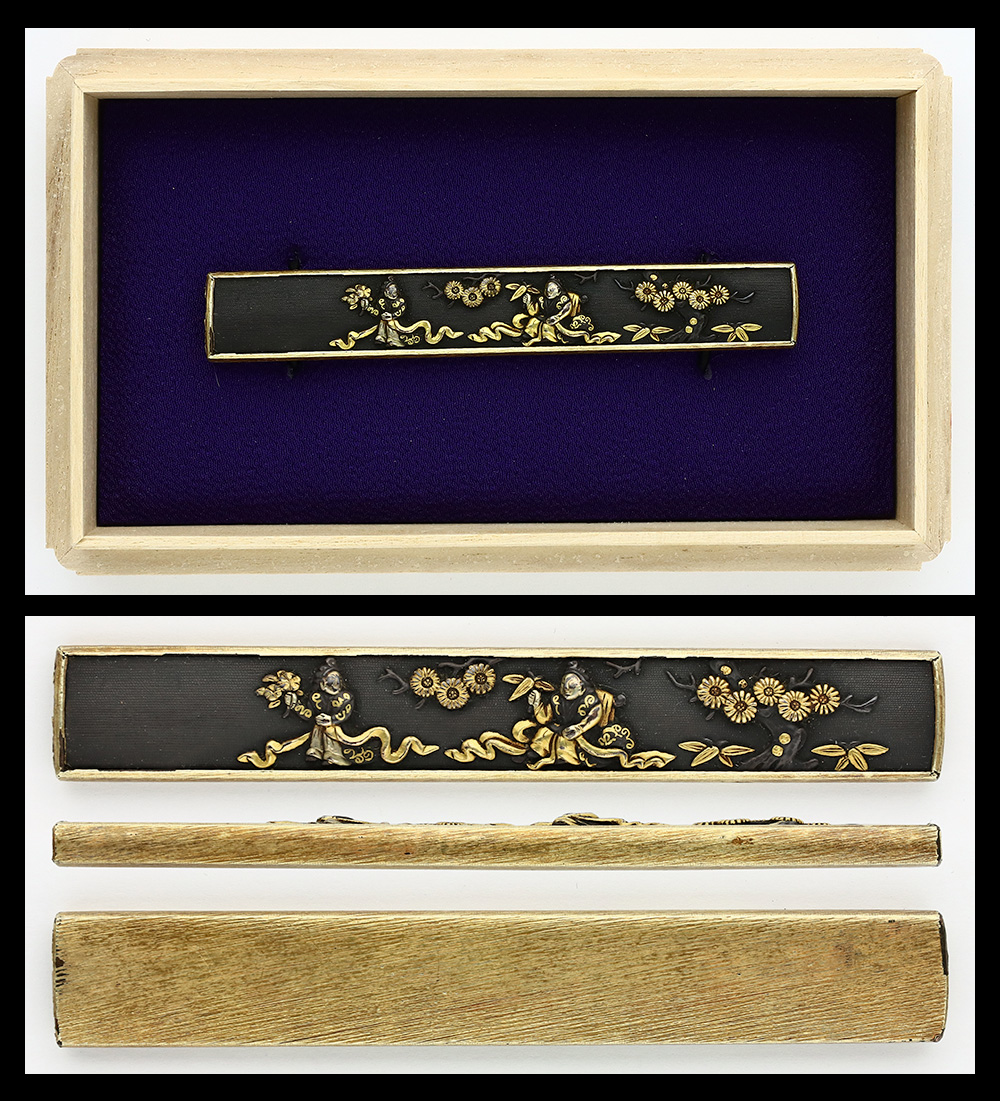 Features: Shakudo nanako base. A combat shece is depicted with gold and silver.