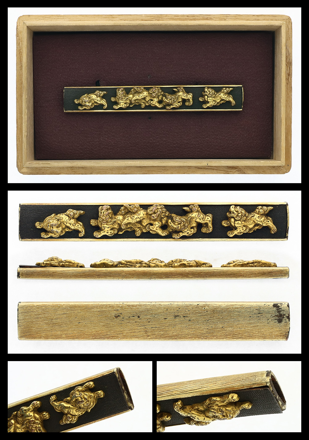 Features: Shakudo nanako base, Shishi dogs are engraved with gold.