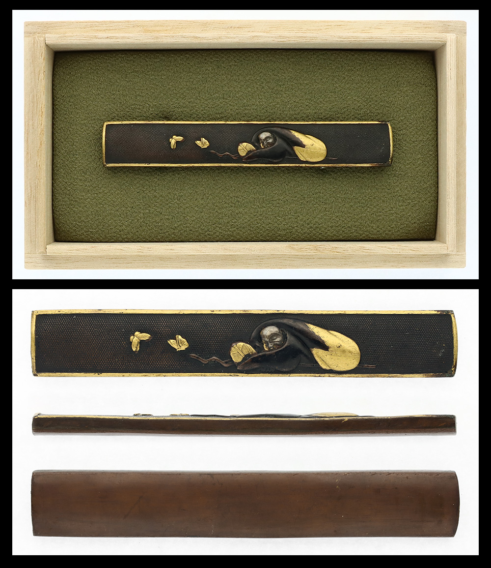 Features: Shakudo nanako base. A monk is engraved with gold. The tail side is copper.