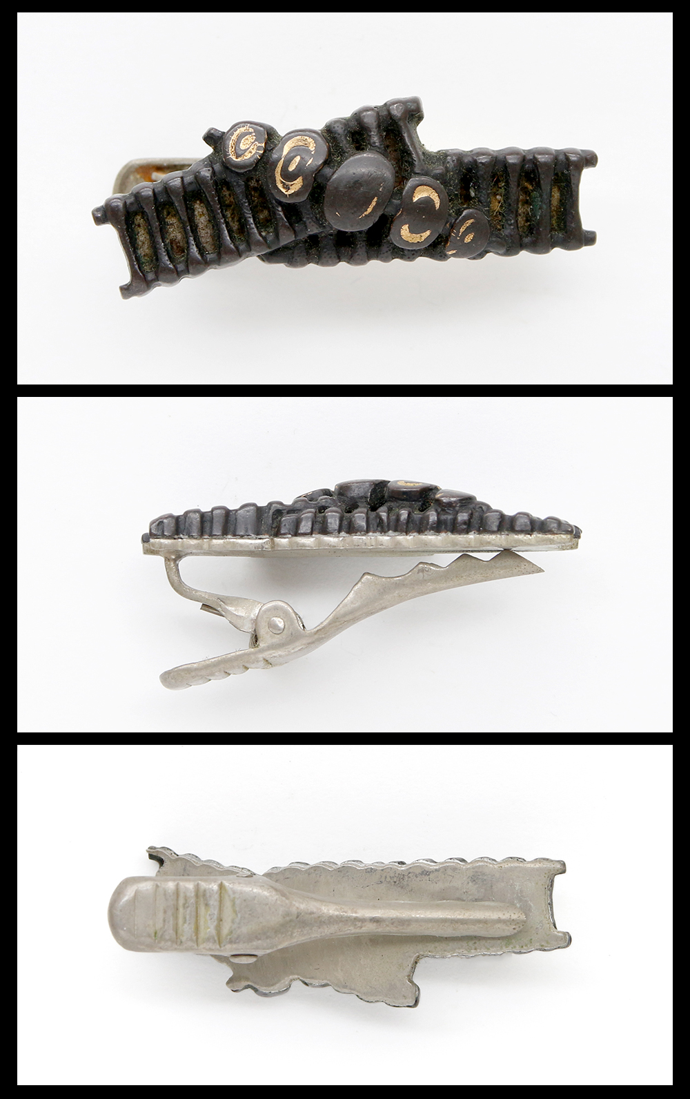 Special feature: Shakudo Menuki crafted at Edo period fixed to use as a clip. Silverplate is used for attachment.
