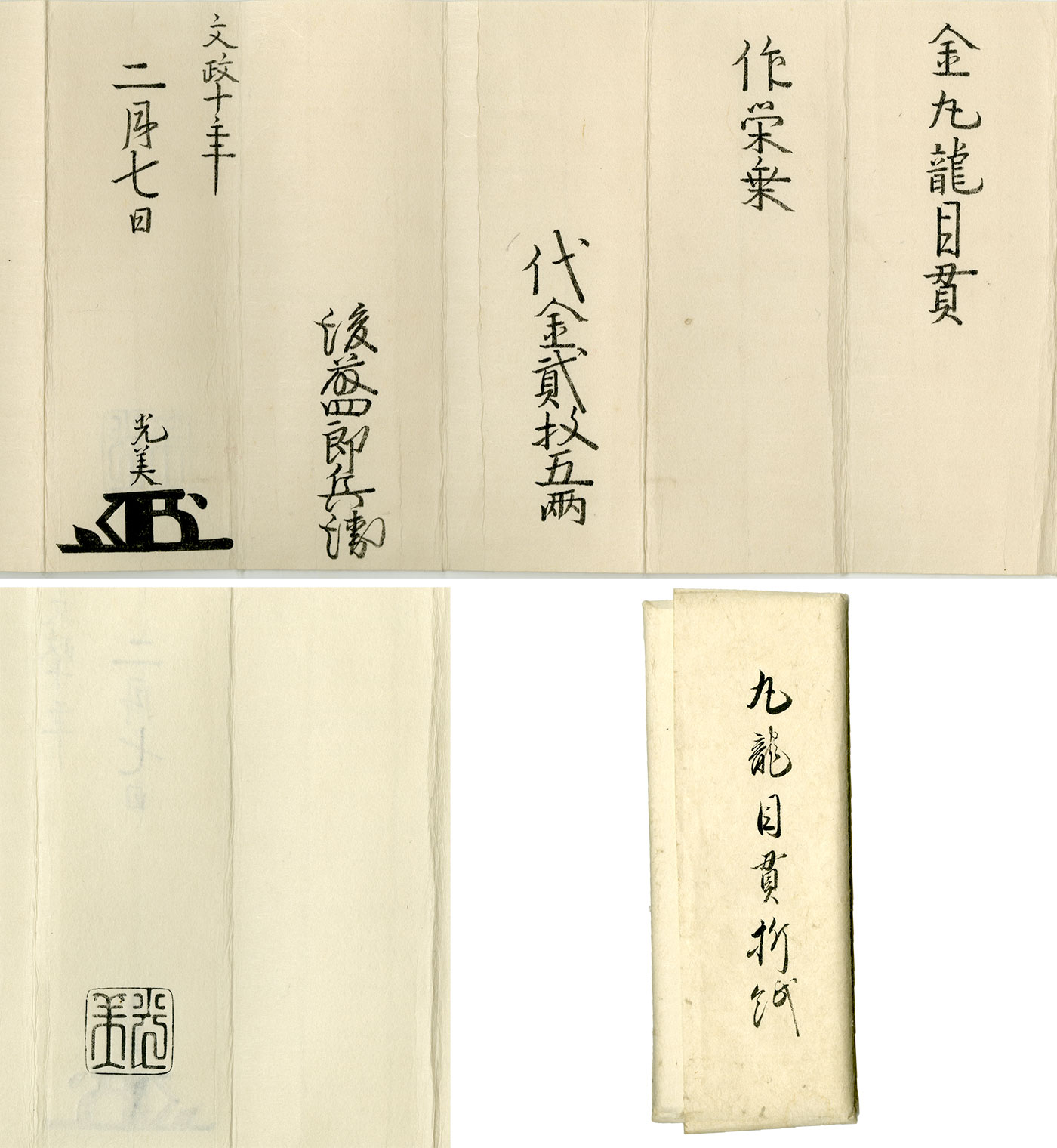 The details of the origami (appraisal paper) are unclear, but it appears to have been issued by Hon'ami Mitsuyoshi, an appraiser from the Shōwa period.