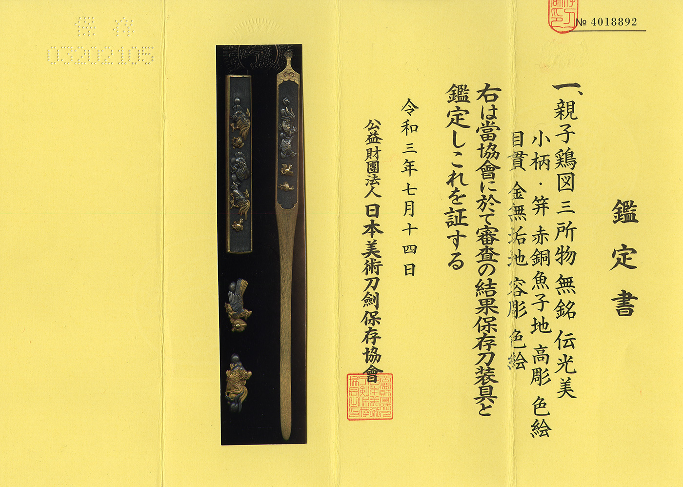 Mitokoro-mono: Set of Tosogu: ( Kogai, Kozuka, Menuki): (NBTHK Tokubetsu Hozon Tosogu)