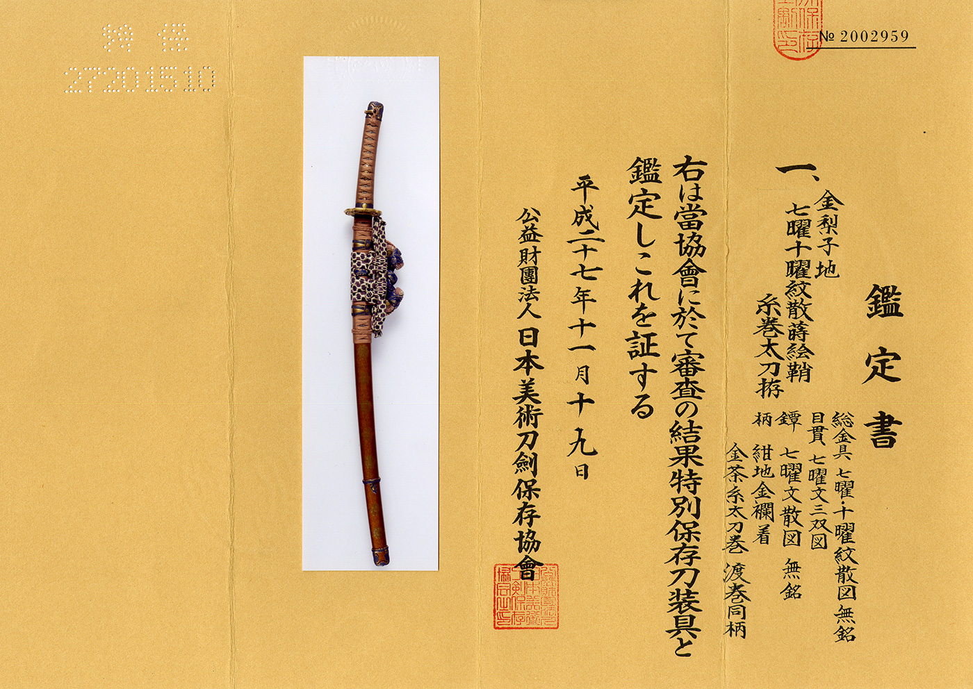metal fittings: Shakudo nanako with Shichiyomon and Juyomon
