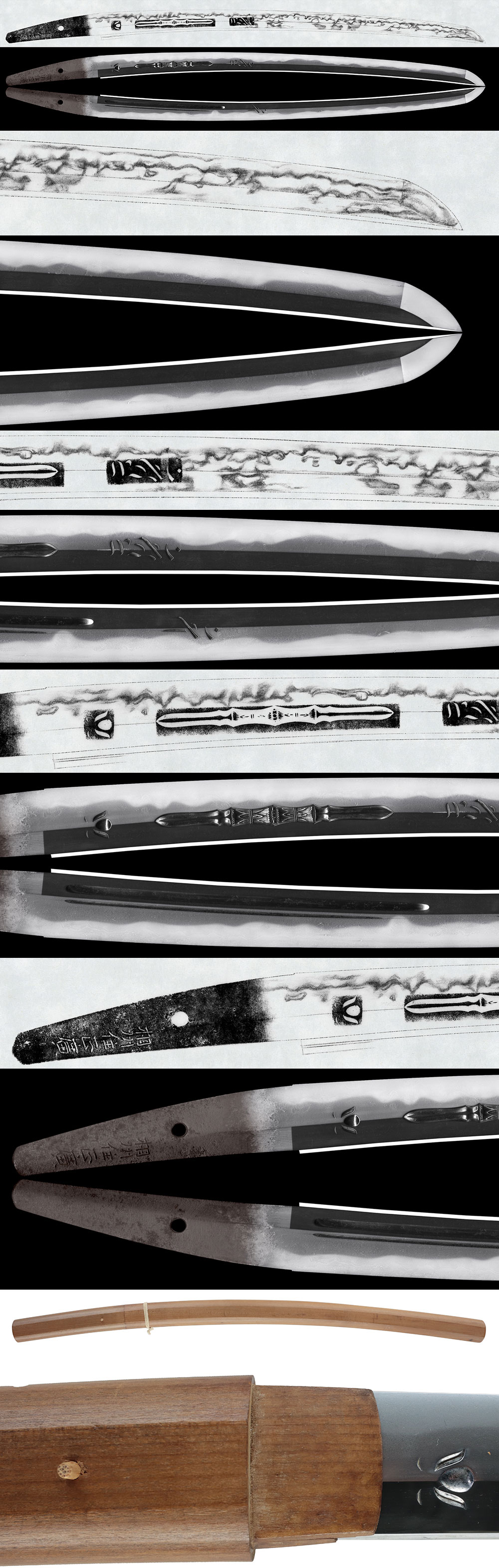 Hamon: Nie-based gunome-midare with a soft nioiguchi. The hamon appears also on the shinogi-ji, overall forming a hitatsura style. Strong nie activity is present toward the kissaki with a deep turn-back.