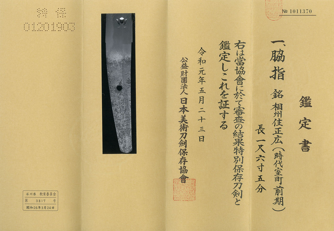 Features: Soshu ju Masahiro was a swordsmith of Sagami, active from the Nanbokucho period into the Muromachi period, continuing his work until around the Eiroku era (1558–1570).