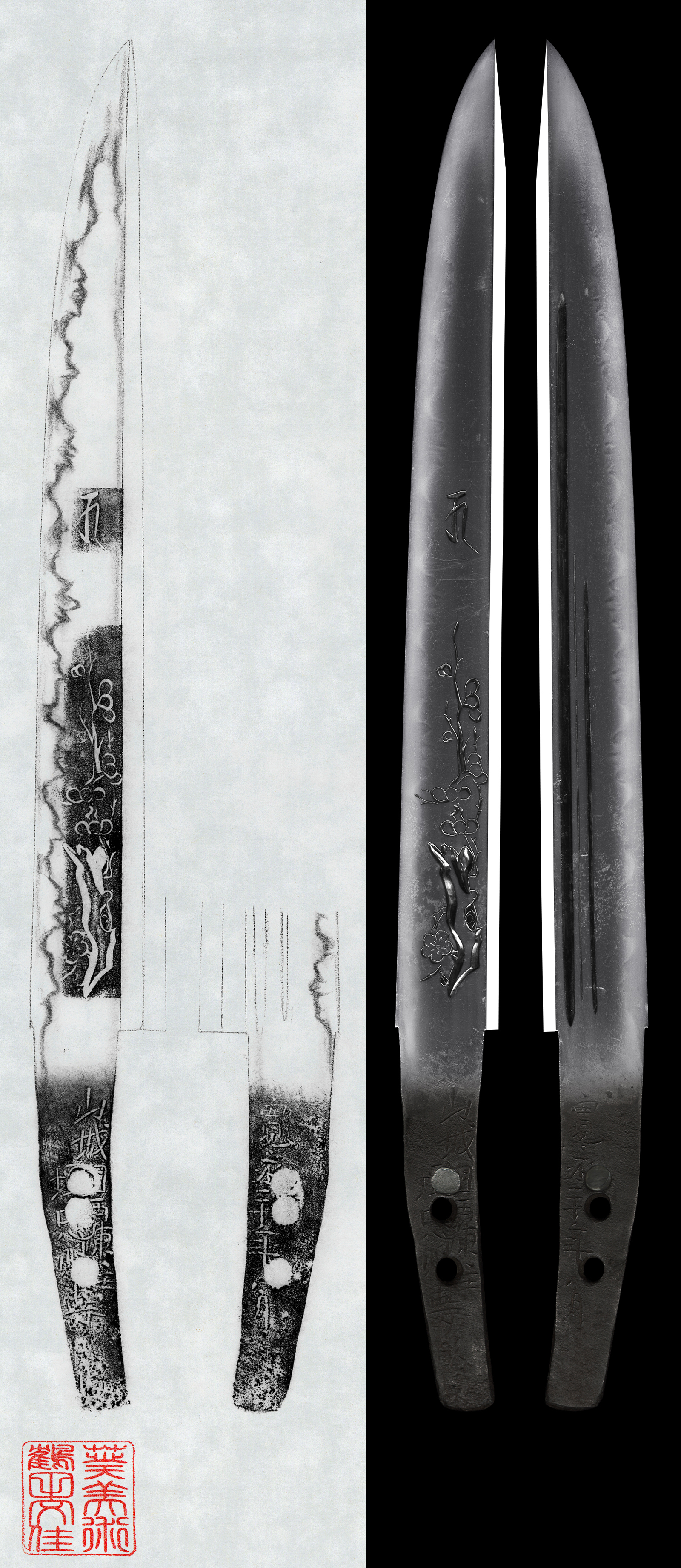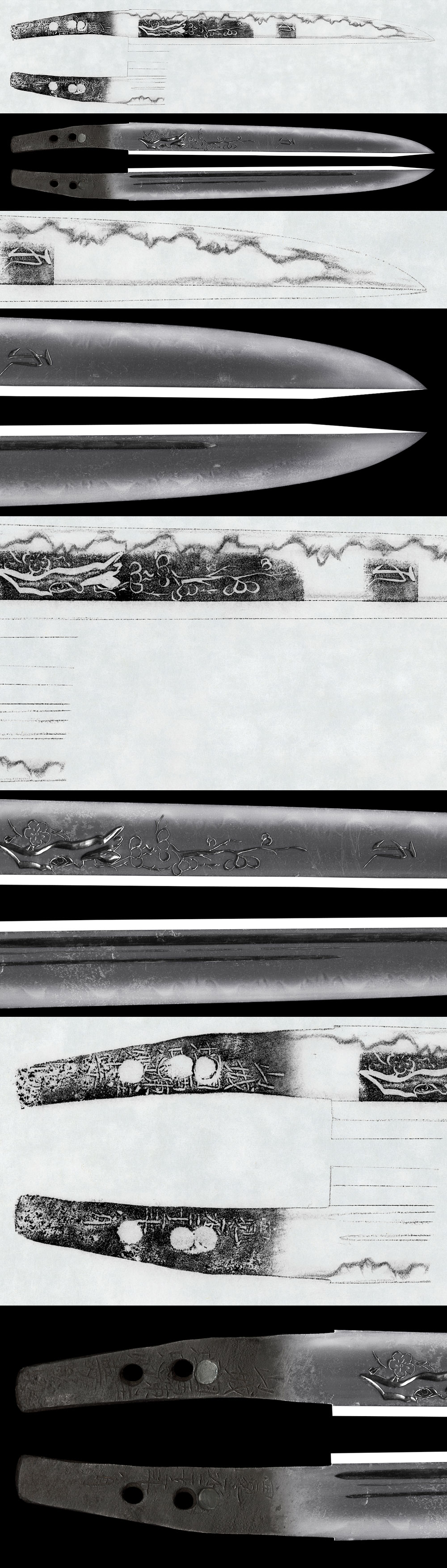 From Aoi Art: Unfortunately, it is a fake Tanto. It is a Yodoidoshi with plum blossoms/Bonji carving. The blade is powerful with Gunomemidare. Koshirae is elaborately made.