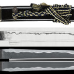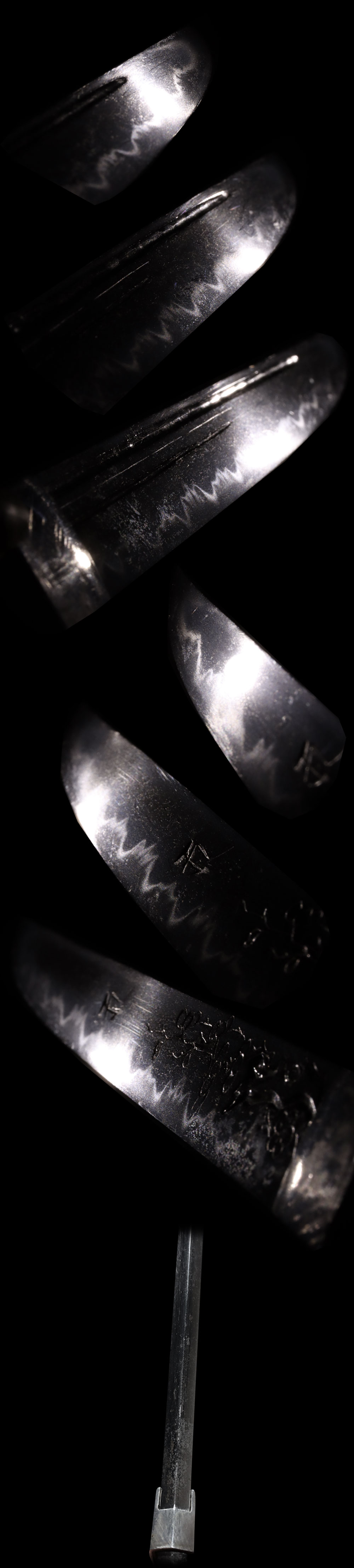 Shape: The blade is broad an thick: Yodoi Doshi shape. There are carvings on the blade: Plum blossoms and Bonji(sanskrit) on the front, 2 lined Hi on the back.