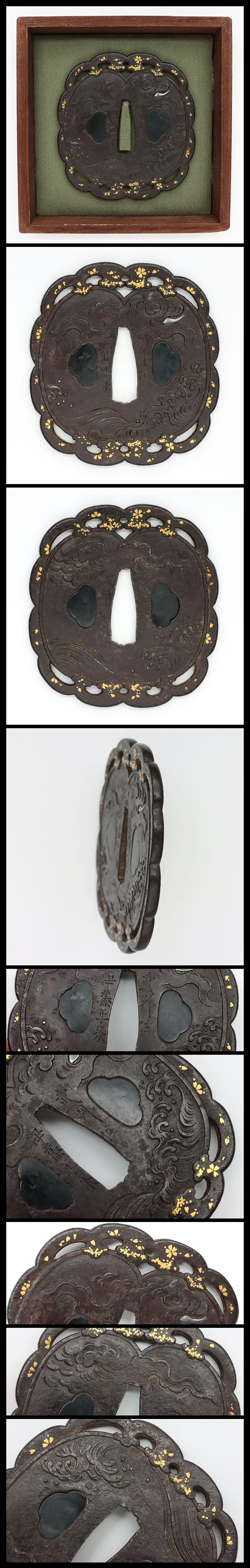 Features: A chrysanthemum-shaped iron plate features a design of snow, moon, and flowers, carved in relief and inlaid.