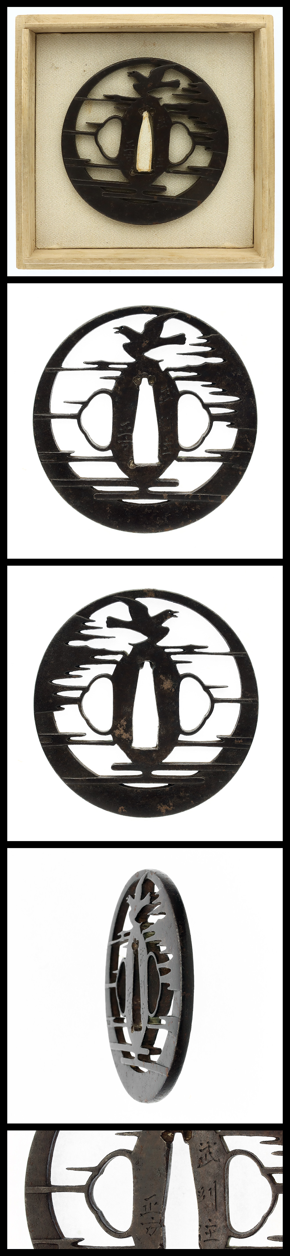 Description: Round iron plate with an openwork design depicting flying wild geese.