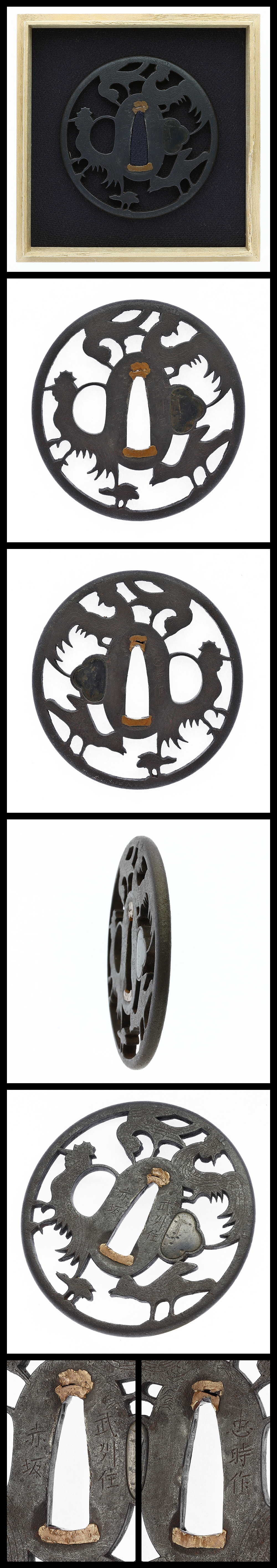 Features: Round-shaped iron tsuba with the engraving of chikens and other birds.