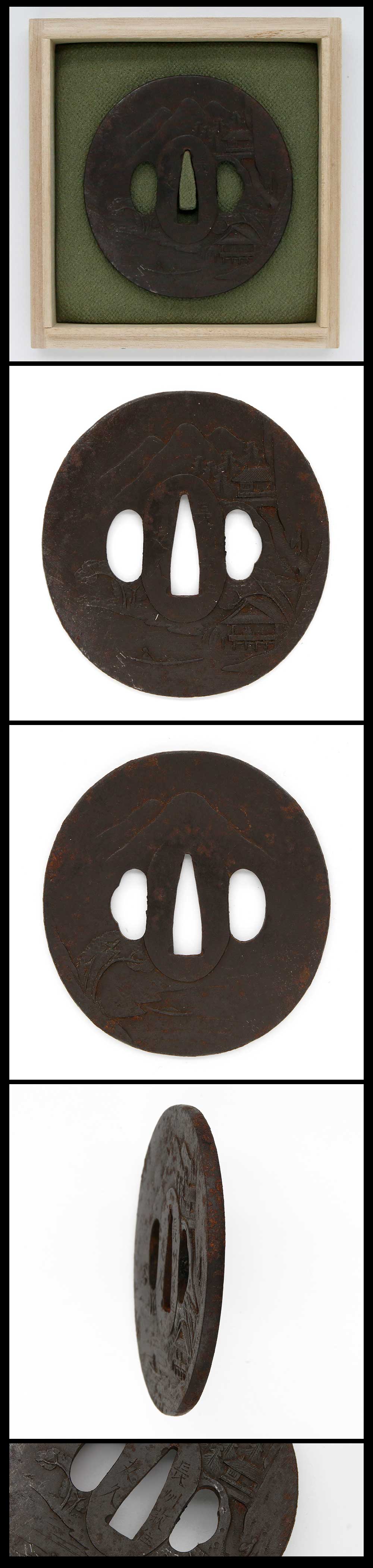 Special feature: Round shape iron Tsuba, the landscape is engraved.