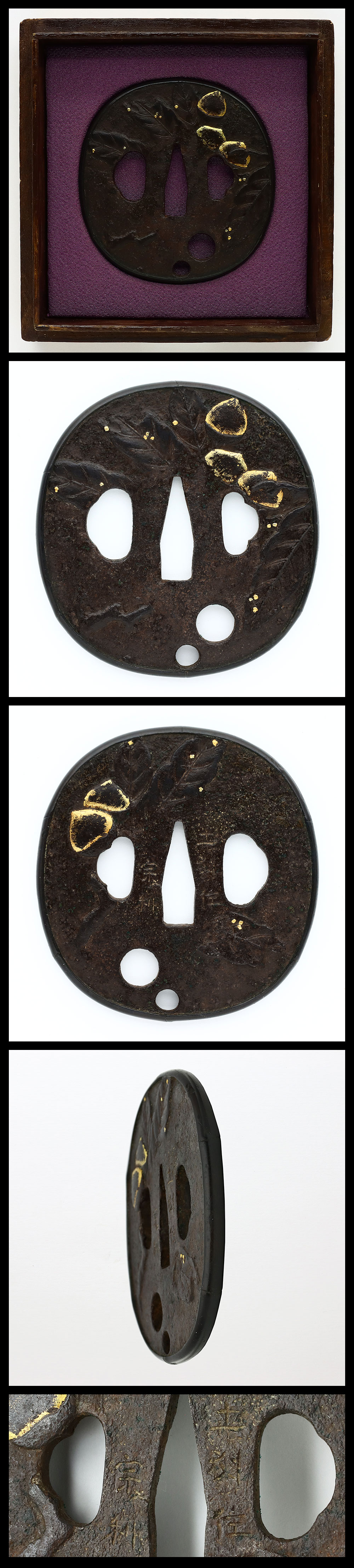 Special feature: Nadekaku-shaped iron Tsuba. Plants are engraved with gold color. The rim is covered by Shakudo.