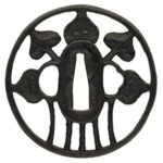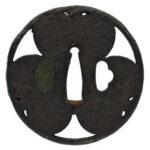 Features: An irregularly shaped iron tsuba with openwork carving (sukashi) of hollyhock (aoi) and arabesque (karakusa) motifs, further decorated with gold inlay.