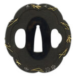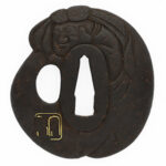 Features: A design of three comma-shaped tomoe forming an eggplant motif is openwork carved into an irregularly shaped iron plate.