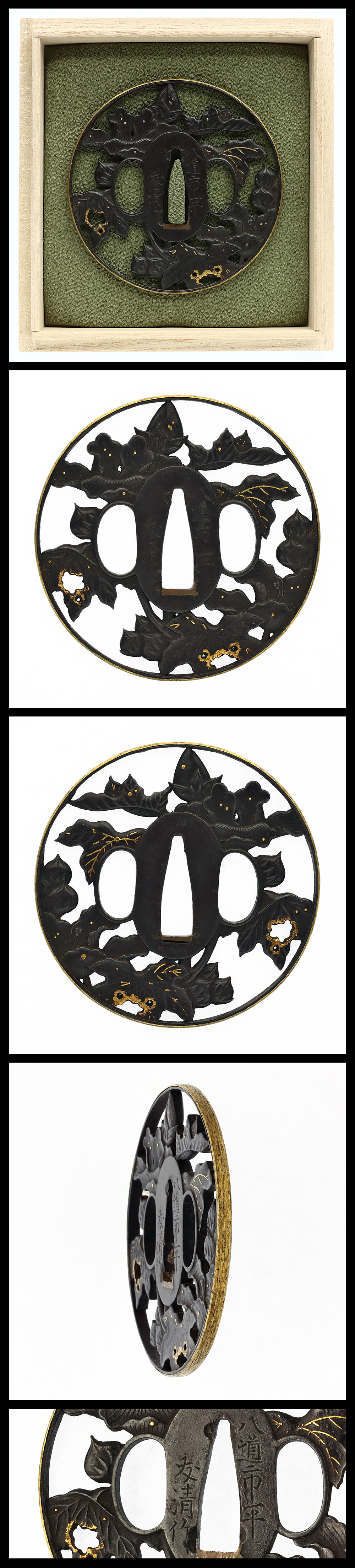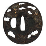 Features: An iron tsuba with a circular floral design in openwork, fitted with a gold rim.