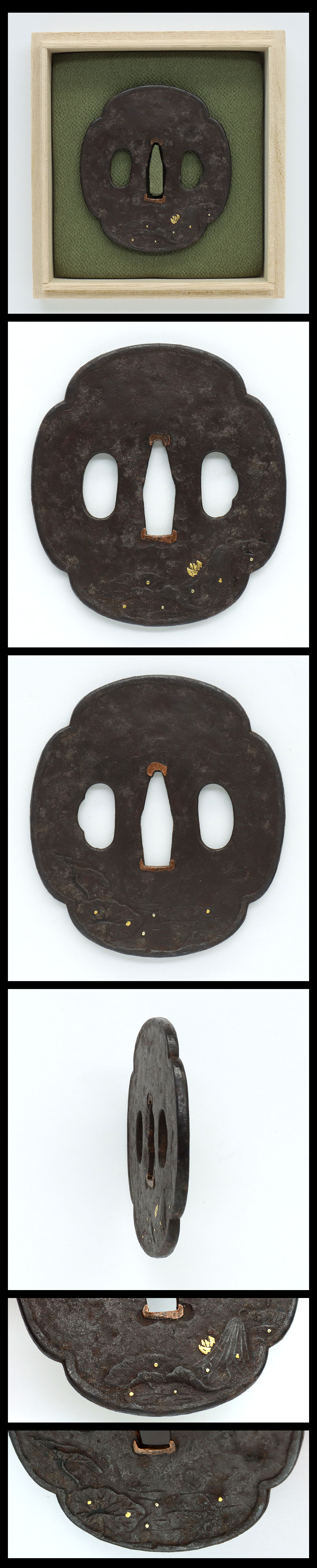Special feature: Mokko style iron Tsuba. Plants are engraved with gold inlays.