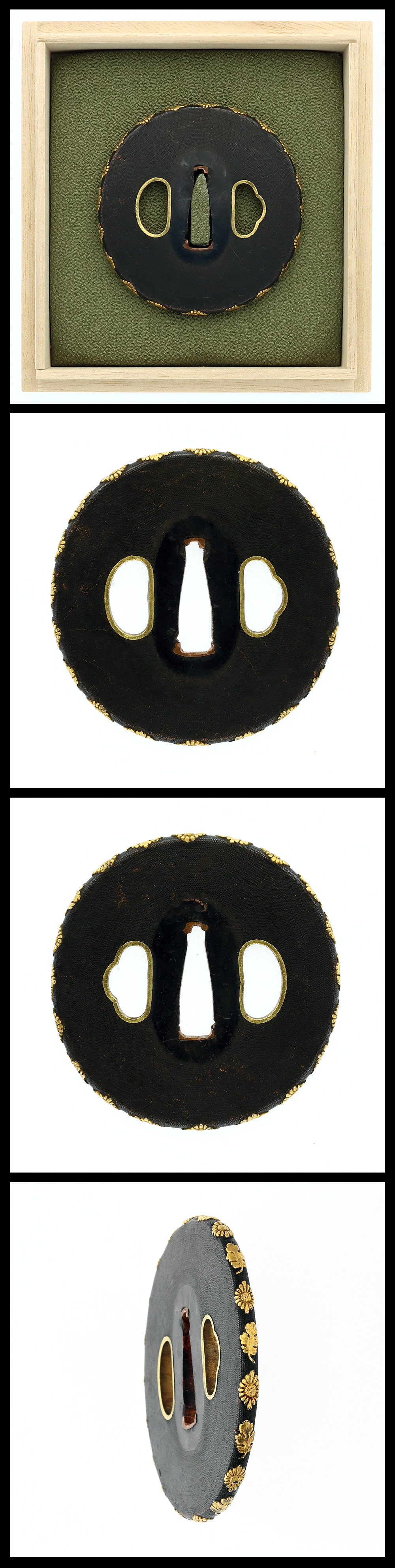Shakudo nanako-ji ground with a design of chrysanthemum and paulownia executed in gold iro-e. The nanako-ji ground extends to the rim, and the carved motif shows refined artistic taste and craftsmanship.