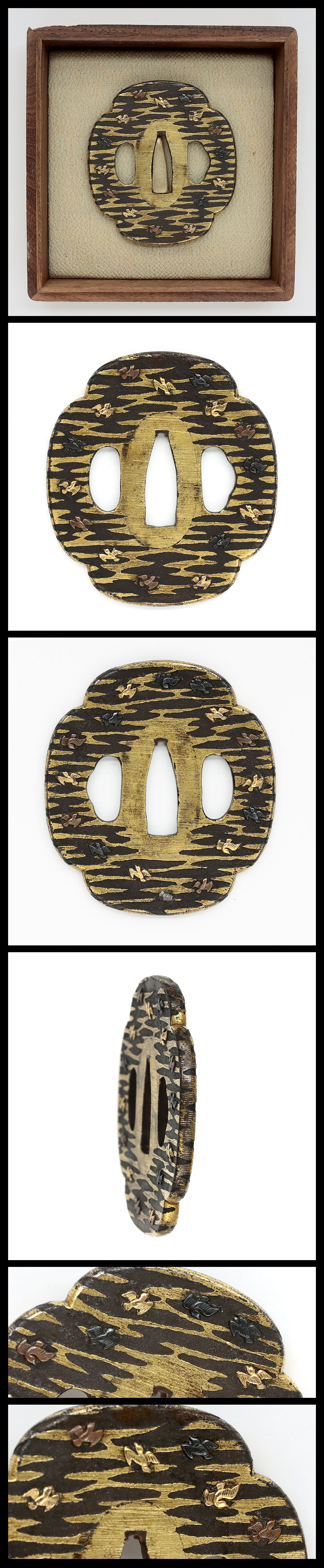Features: On Mokko-shaped Shakudo ishime-ji(Stone texture) base, plovers are engraved with gold.
