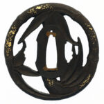 Features: Oval rounded iron base, figures and a mountain are engraved with color.  This Tsuba is good for Koshirae of Wakizashi size.