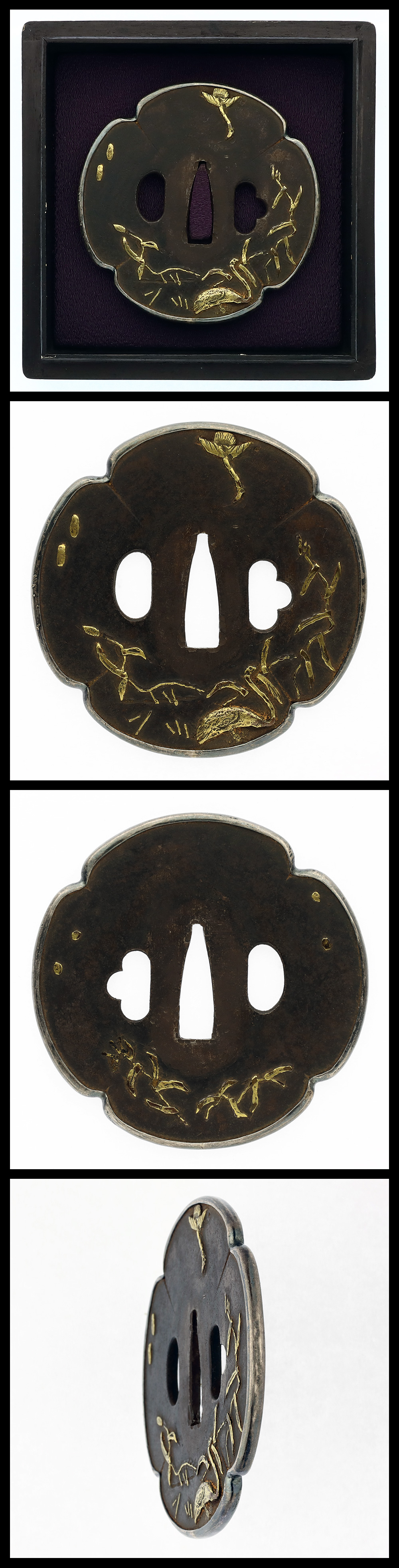 Features: A mokkō-shaped iron tsuba carved with a design of waterside plants and birds, decorated with inlay. The rim is fitted with a silver fukurin (metal rim covering).