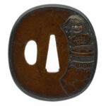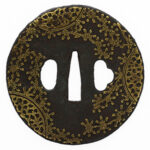 Features: Round-shaped shakudo tsuba with openwork carving and metal-inlaid edge.