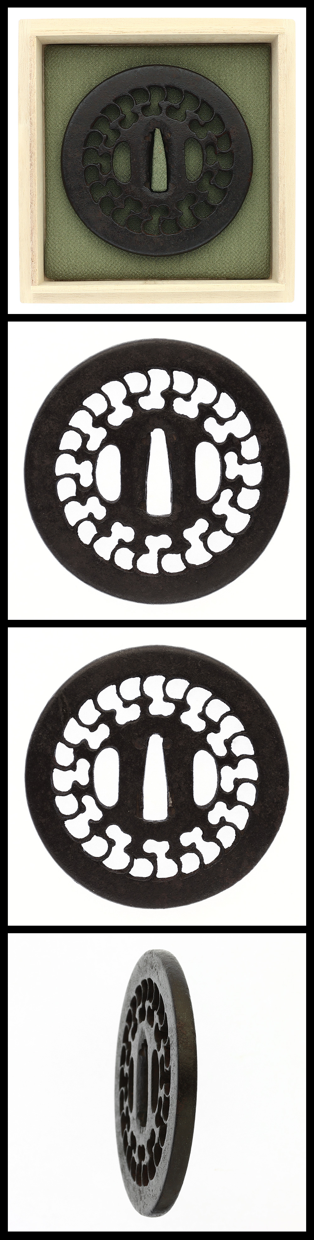 Features: Round-sdhaped iron tsuba with openwork carving.