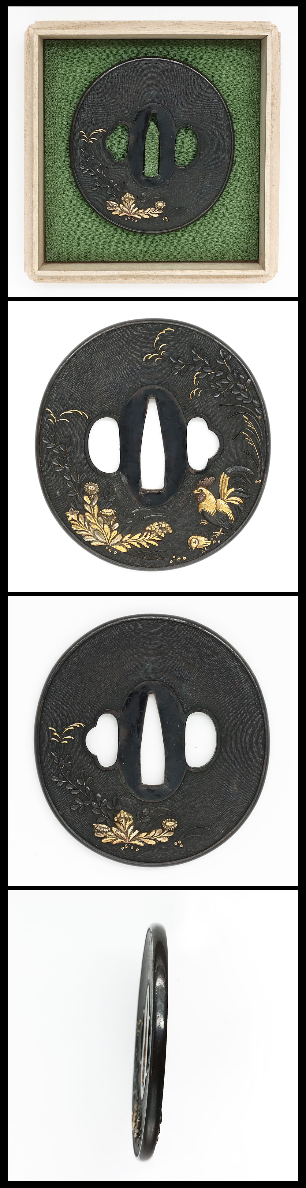 Features: Round-shaped Shakudo nanako Tsuba with inlaid carvings of a chicken and child with flowers and plants. The rim is covered with Shakudo.