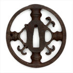 Features: Slightly thick, round-shaped iron tsuba with openwork carving.