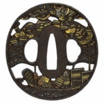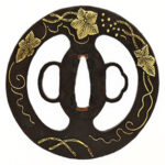 Features: Shodei-sheped (round, swollen underside) iron tsuba carved with a design of clouds and a dragon and gold and silver thin inlays.