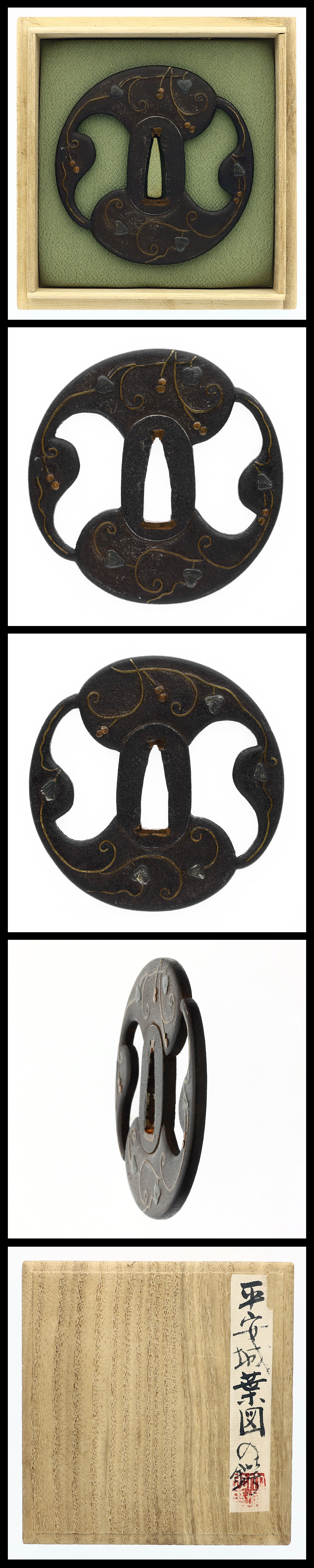 Features: An iron tsuba in the shape of gourds (hyōtan), decorated with a design of vines and gourds in relief, accented with silver and brass inlays.
