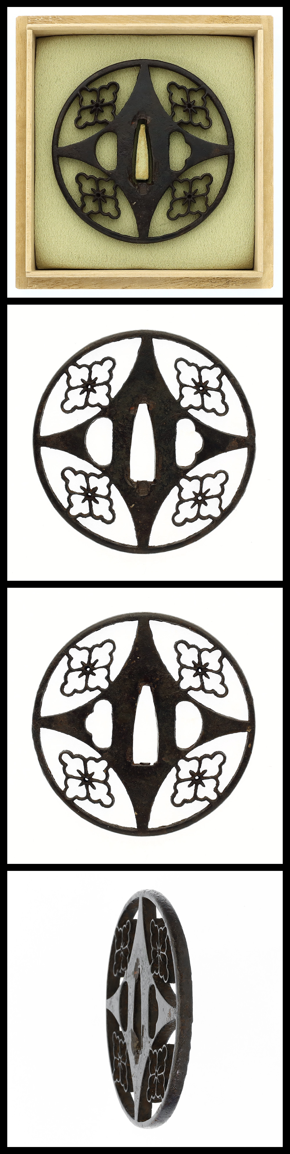 Description: A round iron tsuba with hanabishi (flower-diamond) openwork carvings at the four corners.