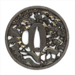 Features: A round iron Tsuba inlaid with silver designs of shells and other motifs.