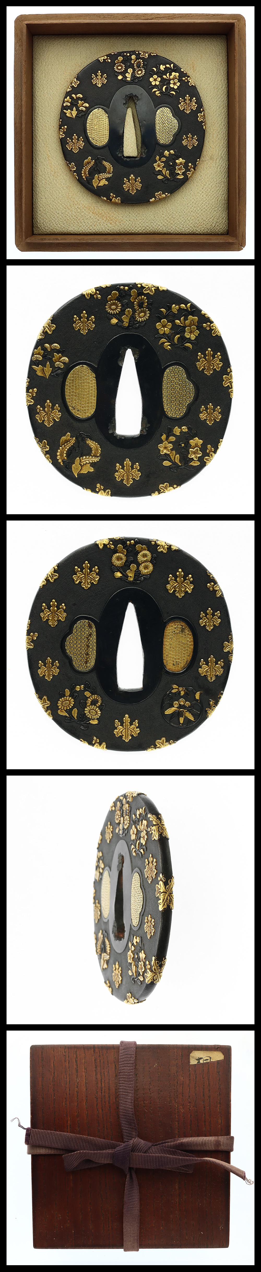 Description:A shakudō nanako ground decorated with paulownia crests and floral roundels, rendered in inlay.