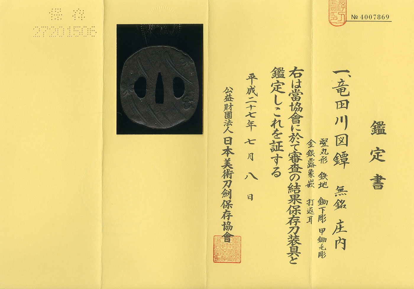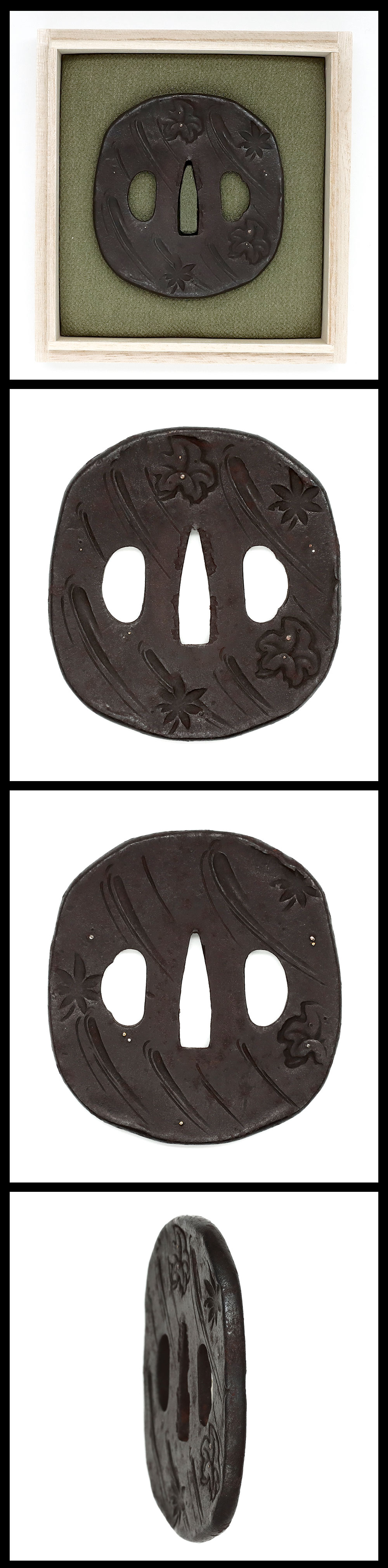 Features: Round-shaped iron tsuba with carving of the Tatsuta river in Nara. The Tatsuta River has been known since ancient times as a famous place for its autumn foliage.