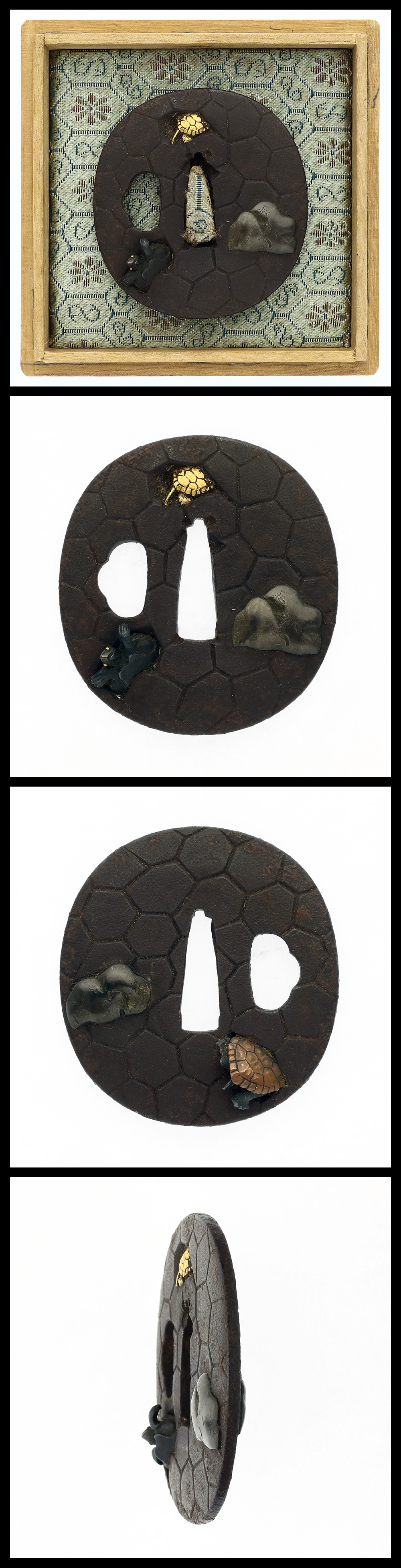 Features: An iron tsuba decorated with a tortoiseshell (kikkō) pattern and a turtle design.