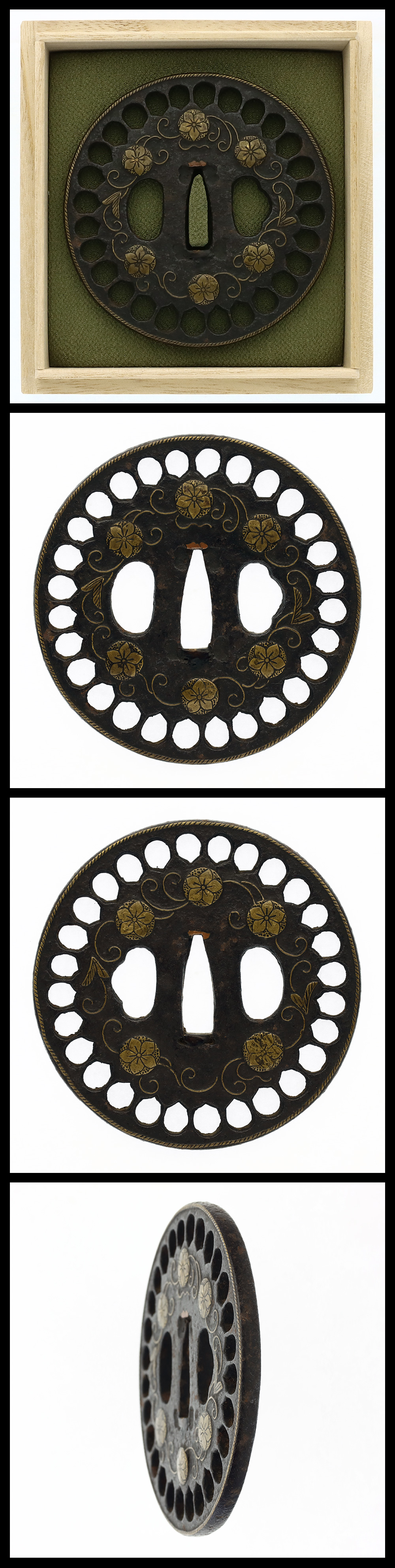A round iron tsuba featuring an openwork design of cherry blossoms, accented with brass inlay details.