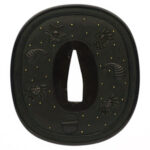 Features: Autumn grasses are carved in sukidashi-bori on a shakudo nanako ground, set into an iron tate-maru gata base. Gold inlay and iroe (colored) details.
