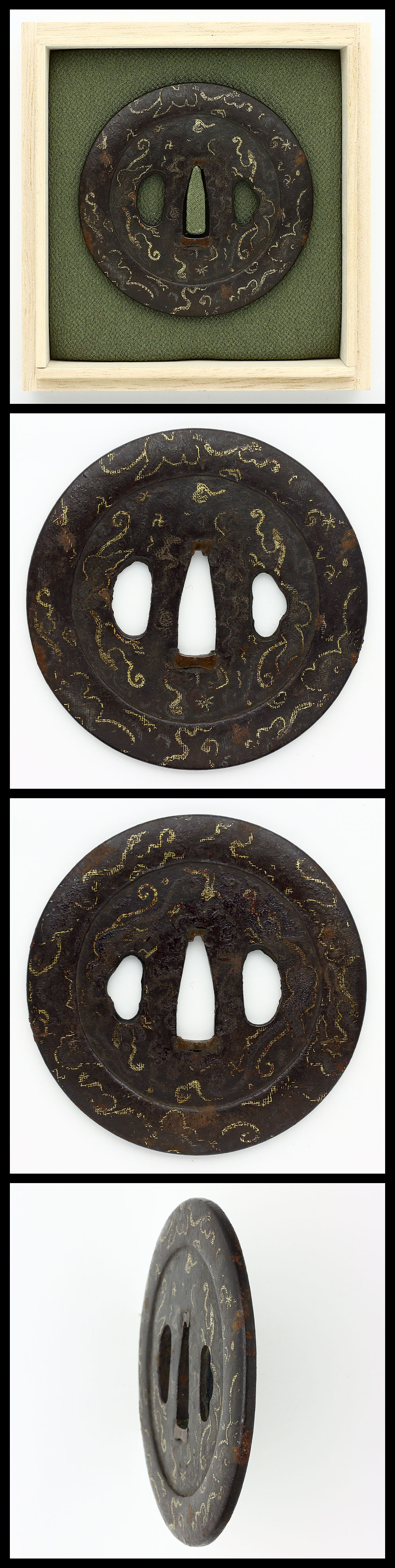 Special feature: Round-shaped iron Tsuba. Patterns are engraved with cloth-inlay.