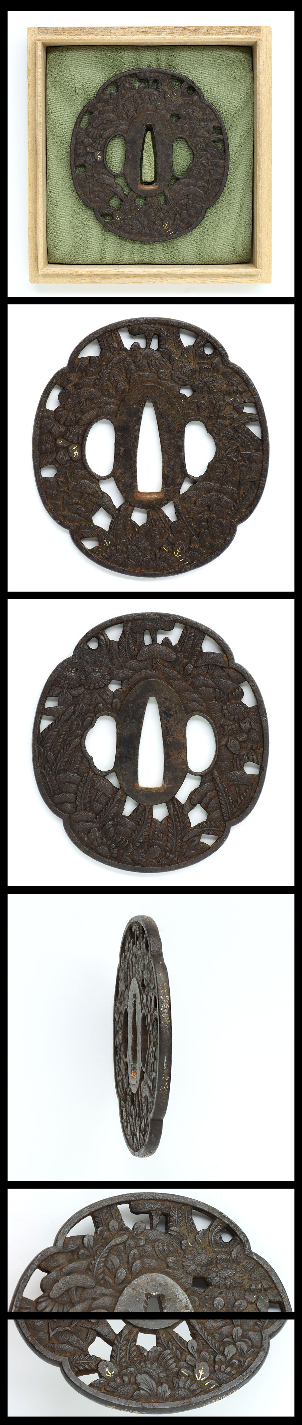 Special feature: Mokko-shaped iron Tsuba. Chrysanthemum and other plants are engraved with gold color cloth-inlay.