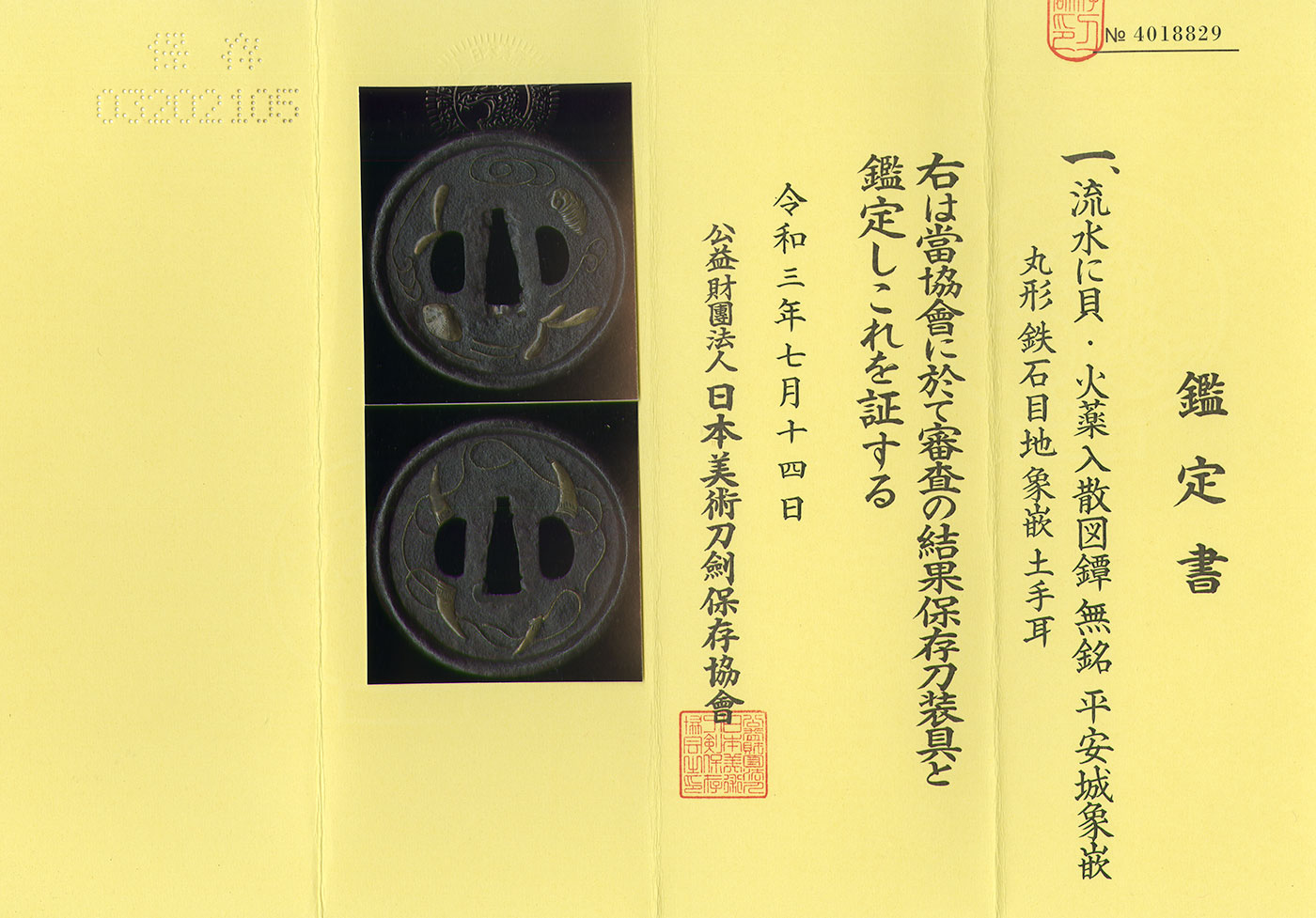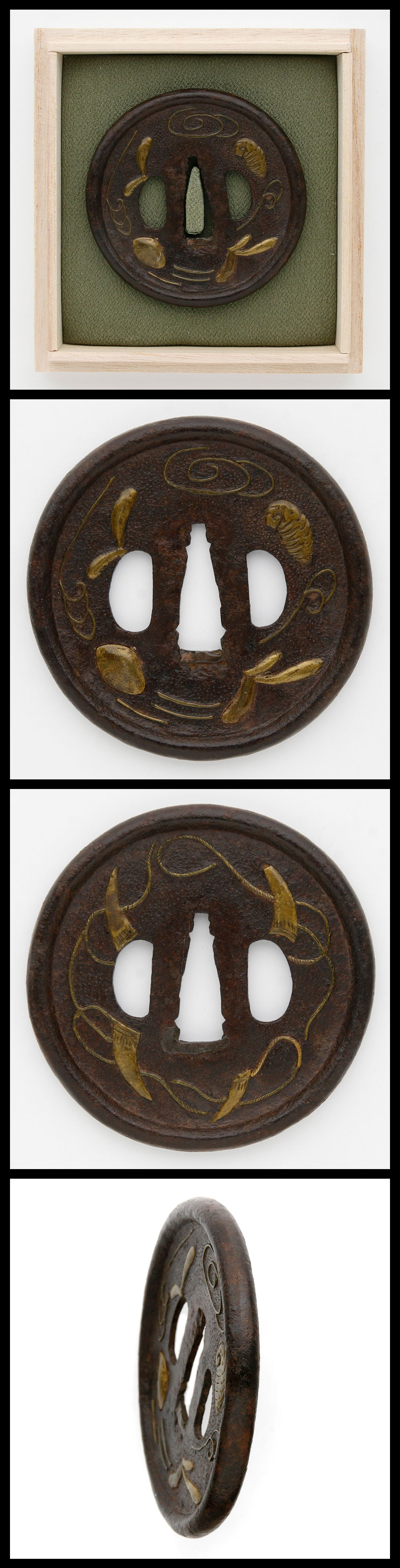 Features: On the Shakudo nanako base, leave and trees are engraved and inlaid with gold and silver.