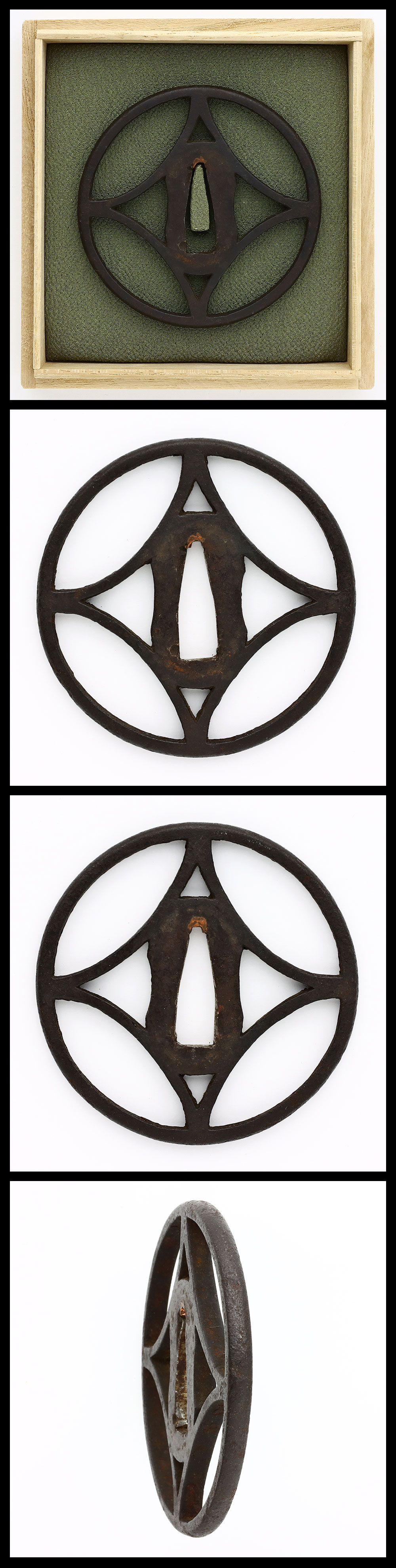 Features: On the rounded Mokko-shaped iron base, a design looks like lattice is engraved with gold and silver.