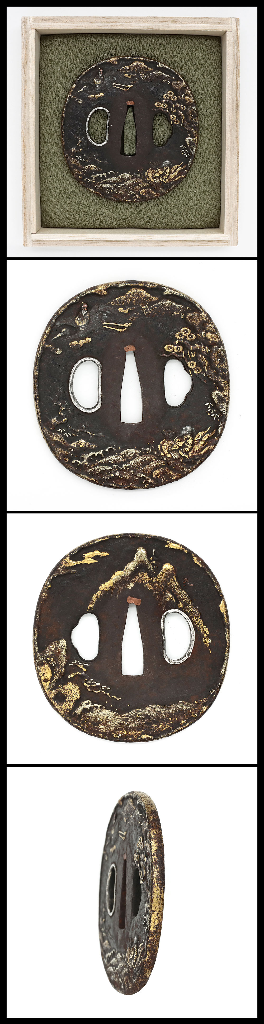 Features: On the round iron plate, a scenary and crane are aengraved with color.