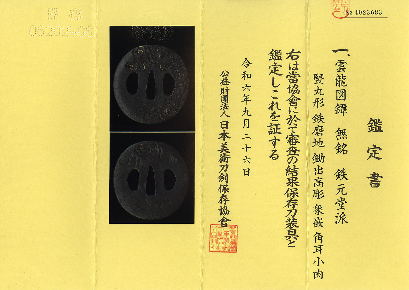 Tsuba:(NBTHK Hozon Tosogu paper) Inscription: Mumei(unsigned)