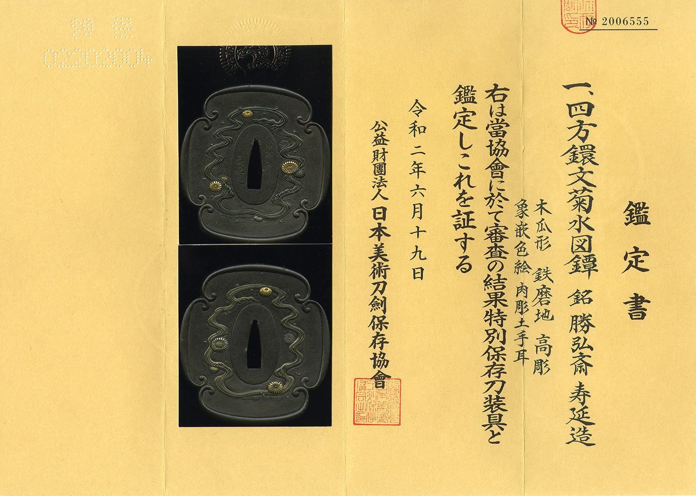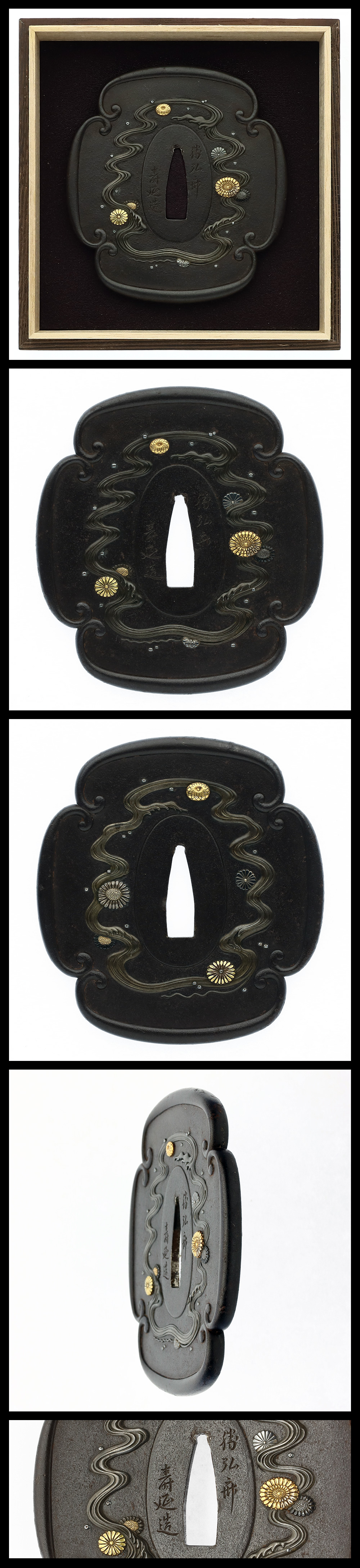 The design of Shihō-Kan Mon Kikusui is executed in high relief with iro-e inlay on a forged iron ground in the mokkō-gata shape.